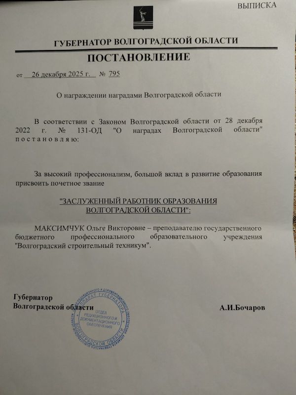 Звание «Заслуженный работник образования Волгоградской области» присвоено преподавателям Галине Бариновой (Волгоградский технологический колледж) и Ольге Максимчук (Волгоградский строительный техникум).