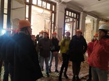 Ребята познакомились с историей объекта, мероприятиями усиления и замены конструктивных элементов. Специалисты укрепляют стены и несущие конструкции, устраивая армокаркасы и укрепляющие сетки; монтируют прогоны ферм над большим зрительным залом.